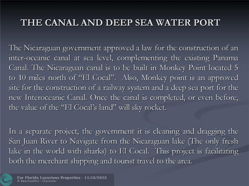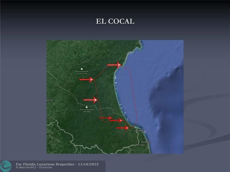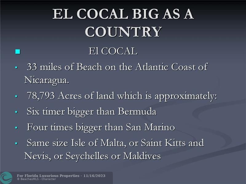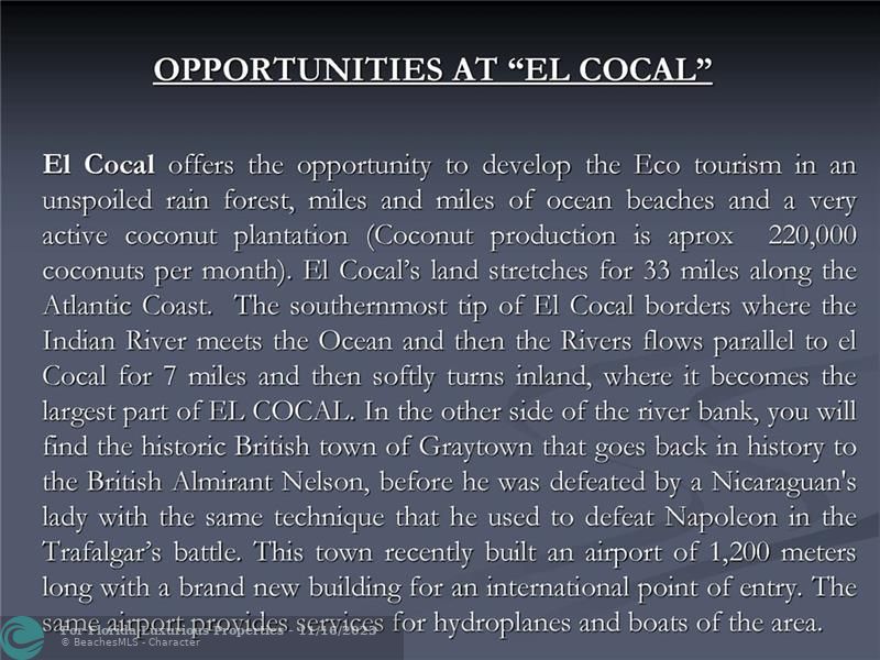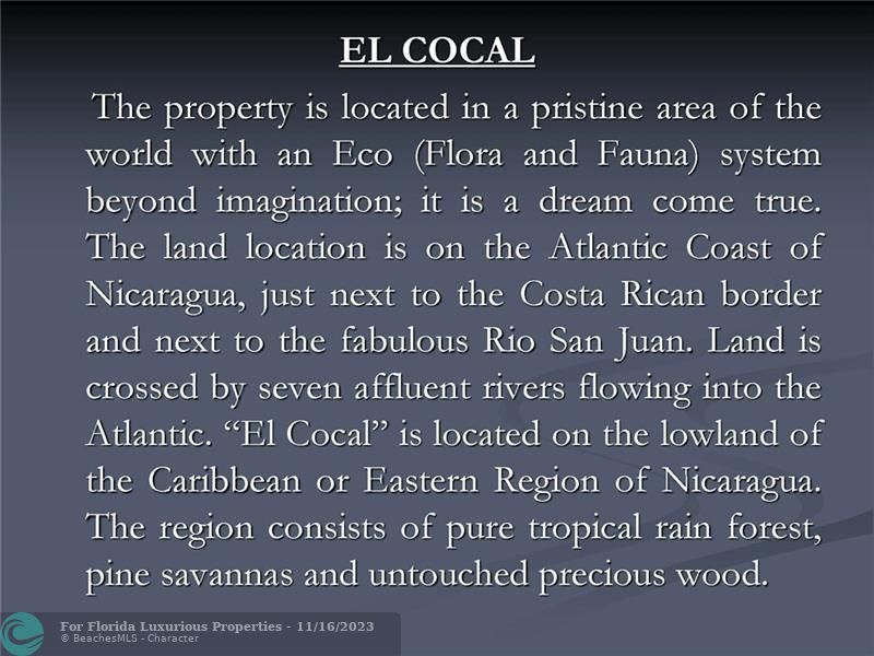 El COCAL • 78,793 Acres (319,000,000 square meters) (32,000 Hectares) of virgin land which is : Six time larger than Bermuda Four times bigger than San Marino Same size Isle of Malta, or Saint Kitts and Nevis, or Seychelles or Maldives. • 60 kilometers (33 miles) of Beaches on the Atlantic/Caribbean Coast of Nicaragua, border lining Costa Rica. • 7 major pristine rivers • Best Eco System and Bio-Diversity in the World • The famous San Juan River which connects the Nicaragua Lake (The only fresh water lake with sharks in the world) ends at El Cocal where it meets the Atlantic/Caribbean Ocean • Next to Greytown, old British Empire settlement and made famous by Almirant Nelson